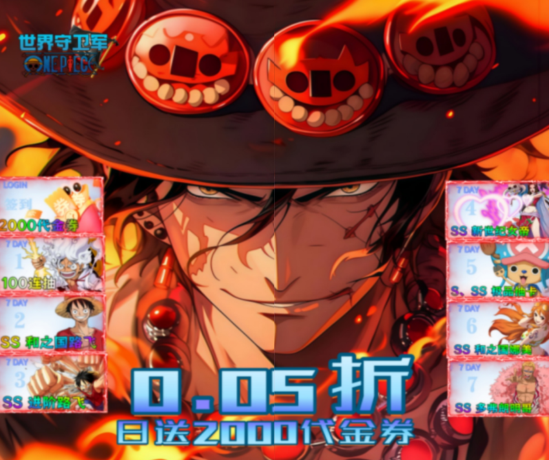 0.05 折手游平台之热游推荐:世界守卫军(0.05折日送2000代金券)是一款正版横版海贼卡牌游戏!游戏内真实还原了路飞一路成长的历程,一路挑战各个关卡,收入各个动漫里面脍炙人口的人物作为自己的伙伴,一起征战新世界!新版百万代金版本强势来袭,首续充值0.05折,每日签到赠送2000代金券,爽玩停不下来;七天奖、新手狂欢、升级奖励、满月礼等大量福利活动,送超多充值卡、体力、抽卡等战力道具;这个海贼王卡牌手游,真的好玩!爱玩!